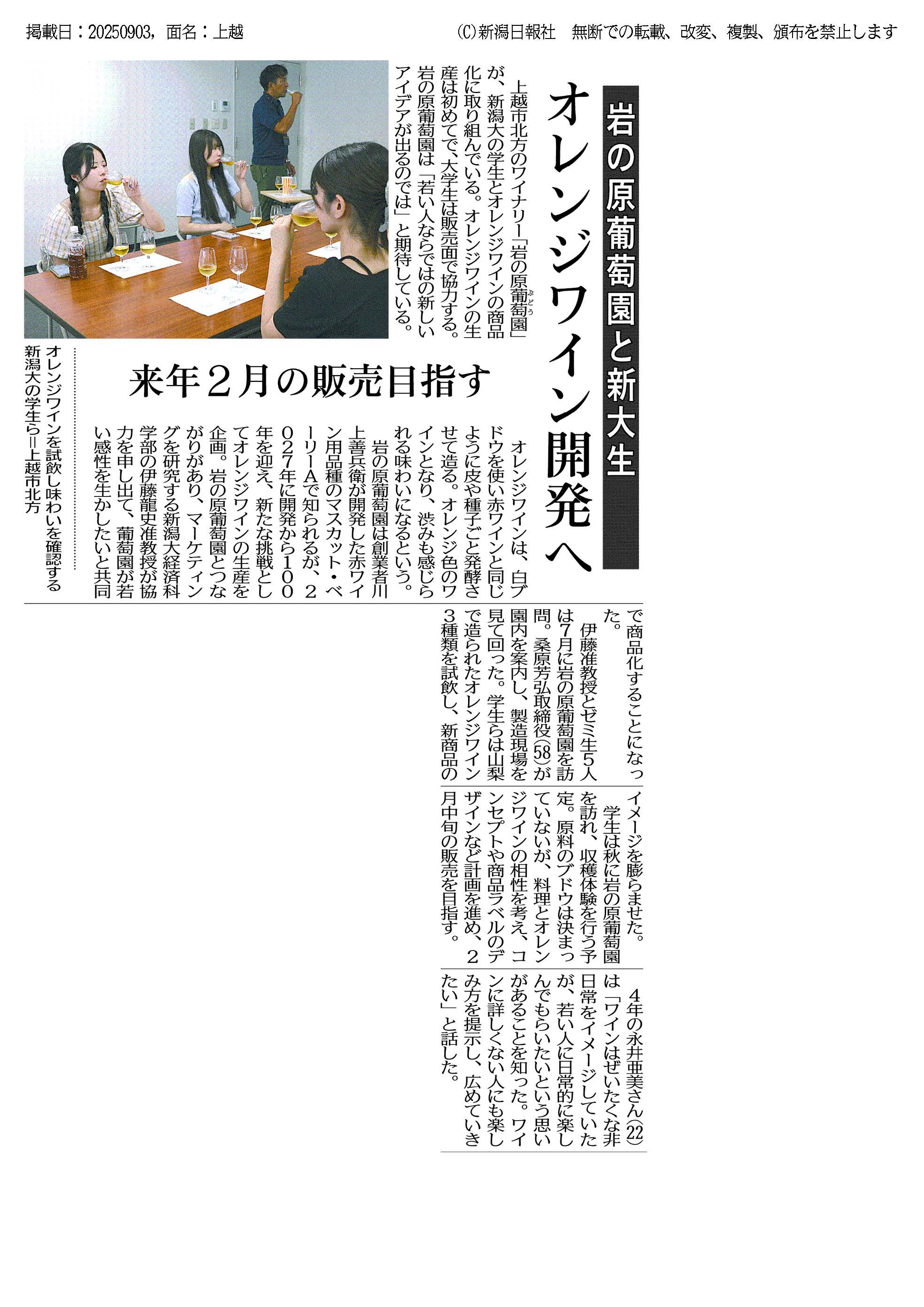 本学部の伊藤龍史ゼミの学生らが上越市にある岩の原葡萄園と2026年2月の販売を目指して、オレンジワインの商品化に取り組んでおり、その旨が取材されました。